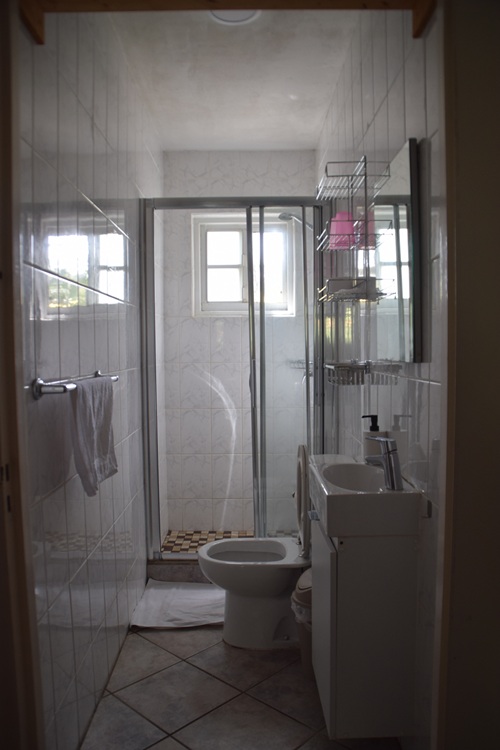 Compared to the size of the apartment, the bathroom is relatively small, but it’s functional. It includes a shower, a small sink, and a toilet.